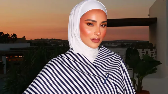 لإطلالة مشرقة وعصرية، يمكنك اختيار تنسيق الحجاب الأبيض مع صيحة الألوان المخططة. كما فعلت دلال الدوب، حيث ارتدت قميصًا واسعًا مخططًا بالأزرق والأبيض، ونسقته مع حجاب قطني أبيض بلفة كلاسيكية ناعمة، خبأت أطرافه تحت ياقة القميص بأسلوب أنيق ومرتب. هذه الإطلالة الصيفية تجمع بين البساطة والرقي، وتناسب إطلالات النهار بشكل مثالي.